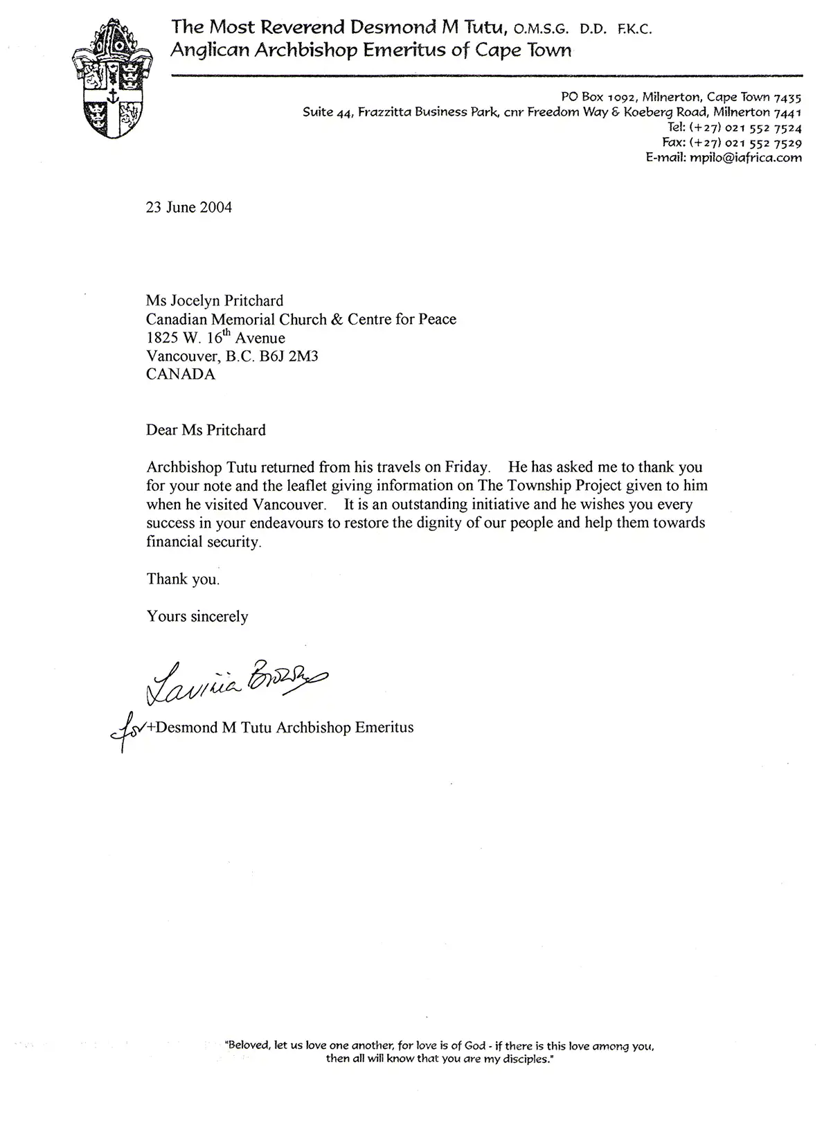 Our Founding Chair and Director Emerita, Jocelyn Pritchard, told Archbishop Tutu of our work when he visited Vancouver in 2004. We were thrilled to receive the letter below in response.